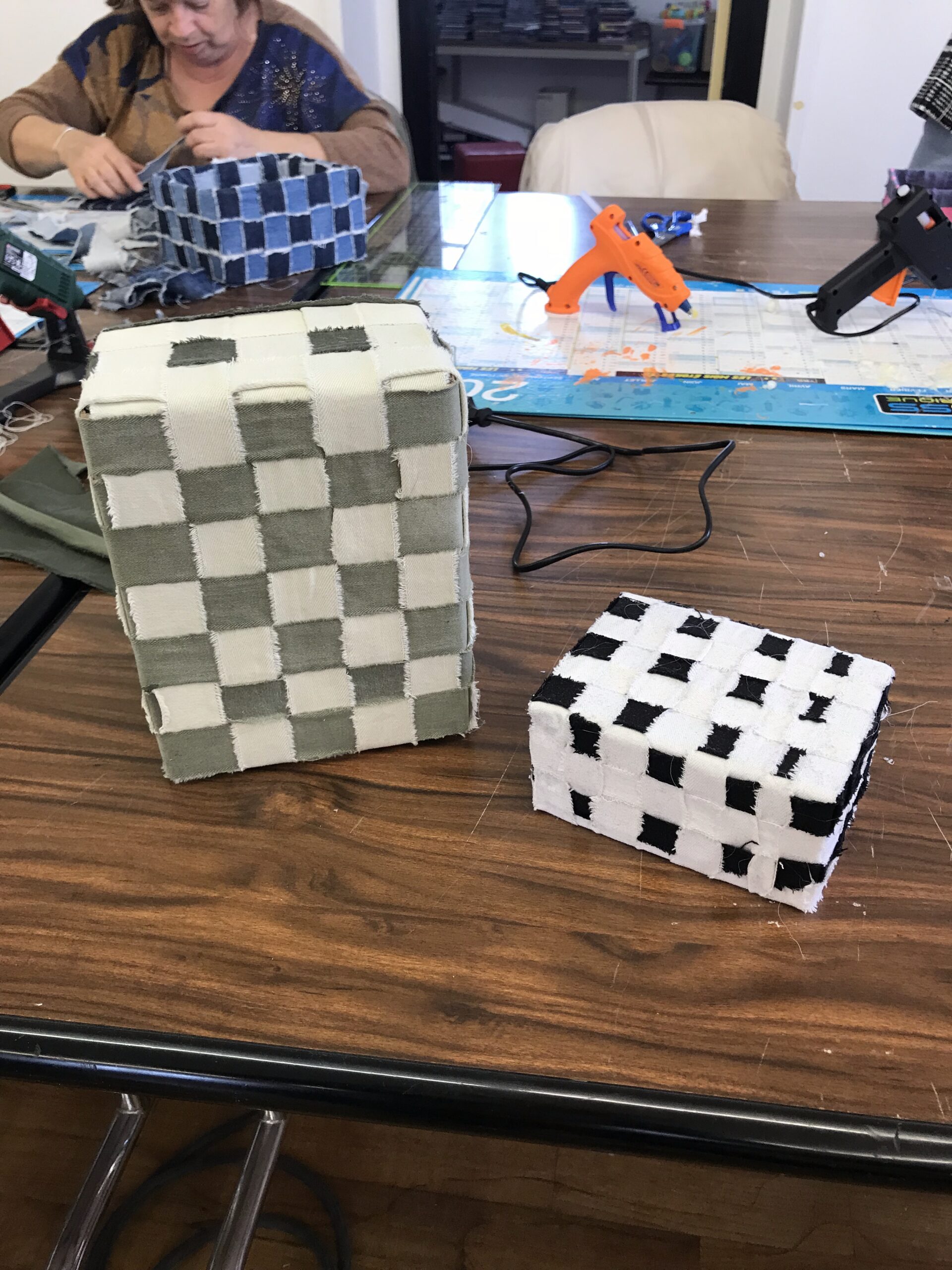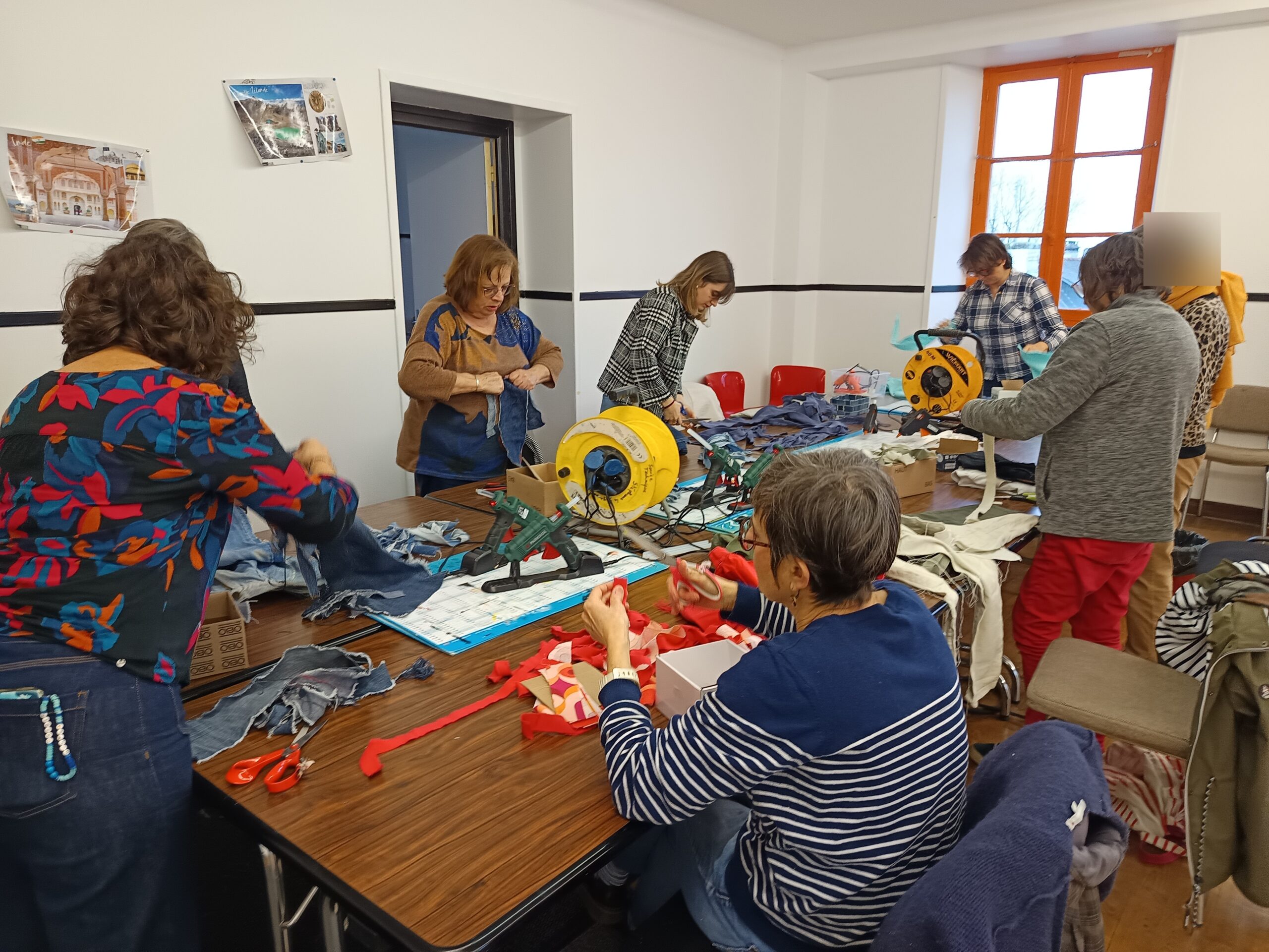 Ce samedi 15 Novembre, 7 personnes ont participé à l’atelier créatif proposé par la médiathèque et Laetitia LE CAGNEC (Un temps pour créer). Les participantes ont réalisé un panier tressé à partir de jeans recyclés. Au programme : choix de la boîte à tresser, choix du coloris du tissu, découpage des bandes de tissus, tressage, collage, assemblage, réalisation du fond de boîte. Un atelier qui s’est déroulé dans la bonne humeur et la franche rigolade !