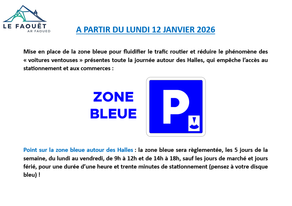 Point sur la zone bleue autour des Halles : la zone bleue sera règlementée, les 5 jours de la semaine, du lundi au vendredi, de 9h à 12h et de 14h à 18h, sauf les jours de marché et jours férié, pour une durée d’une heure et trente minutes de stationnement (pensez à votre disque bleu) !