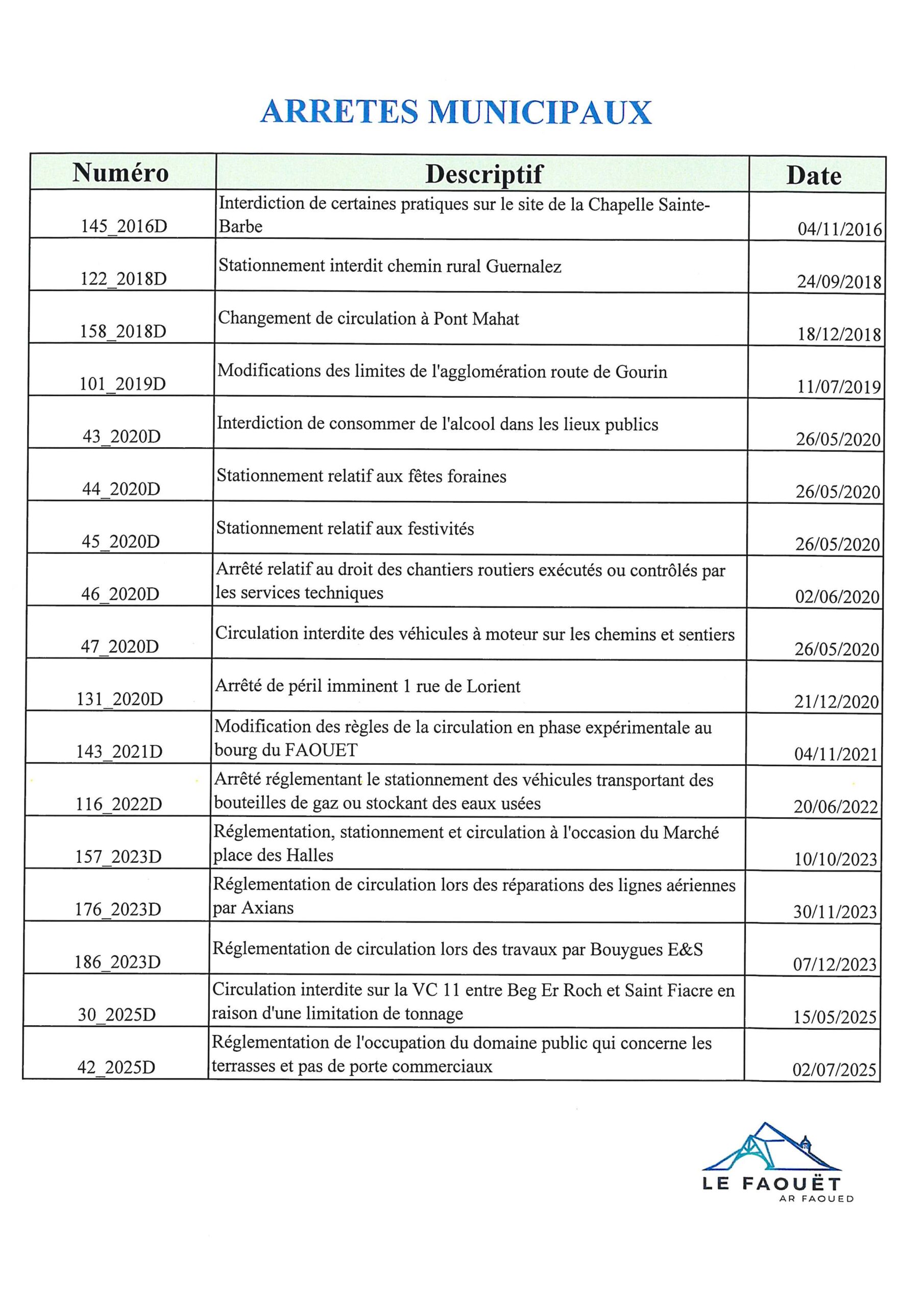 Les documents répertoriés ci-dessous ne représentent pas une liste exhaustive des arrêtés et circulaires municipaux émis, consultables en Mairie :